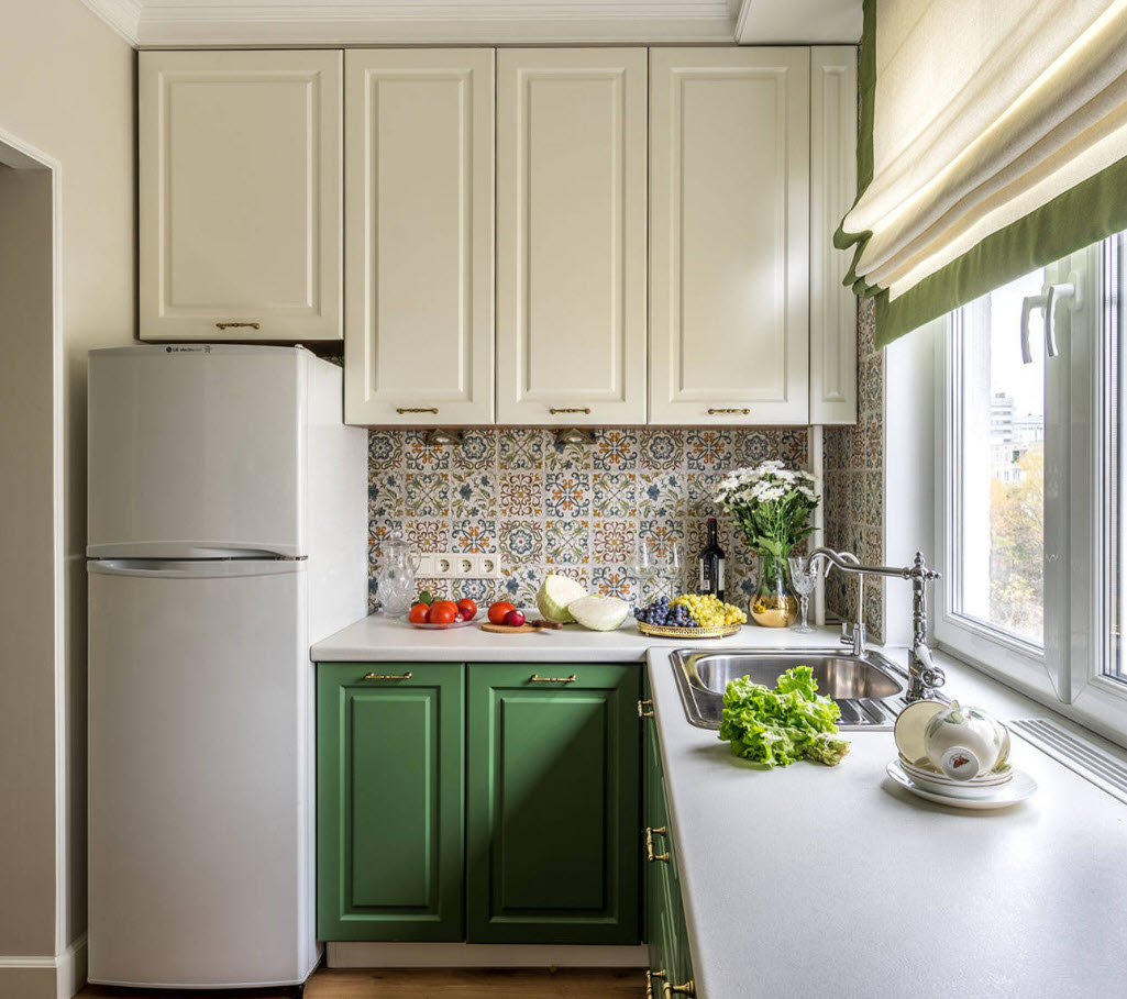 - Если кухня небольшая с маленькими окнами, то уместно бело-оливковое или бело-изумрудное сочетание. Также интерьер дополняют несколькими источниками света;