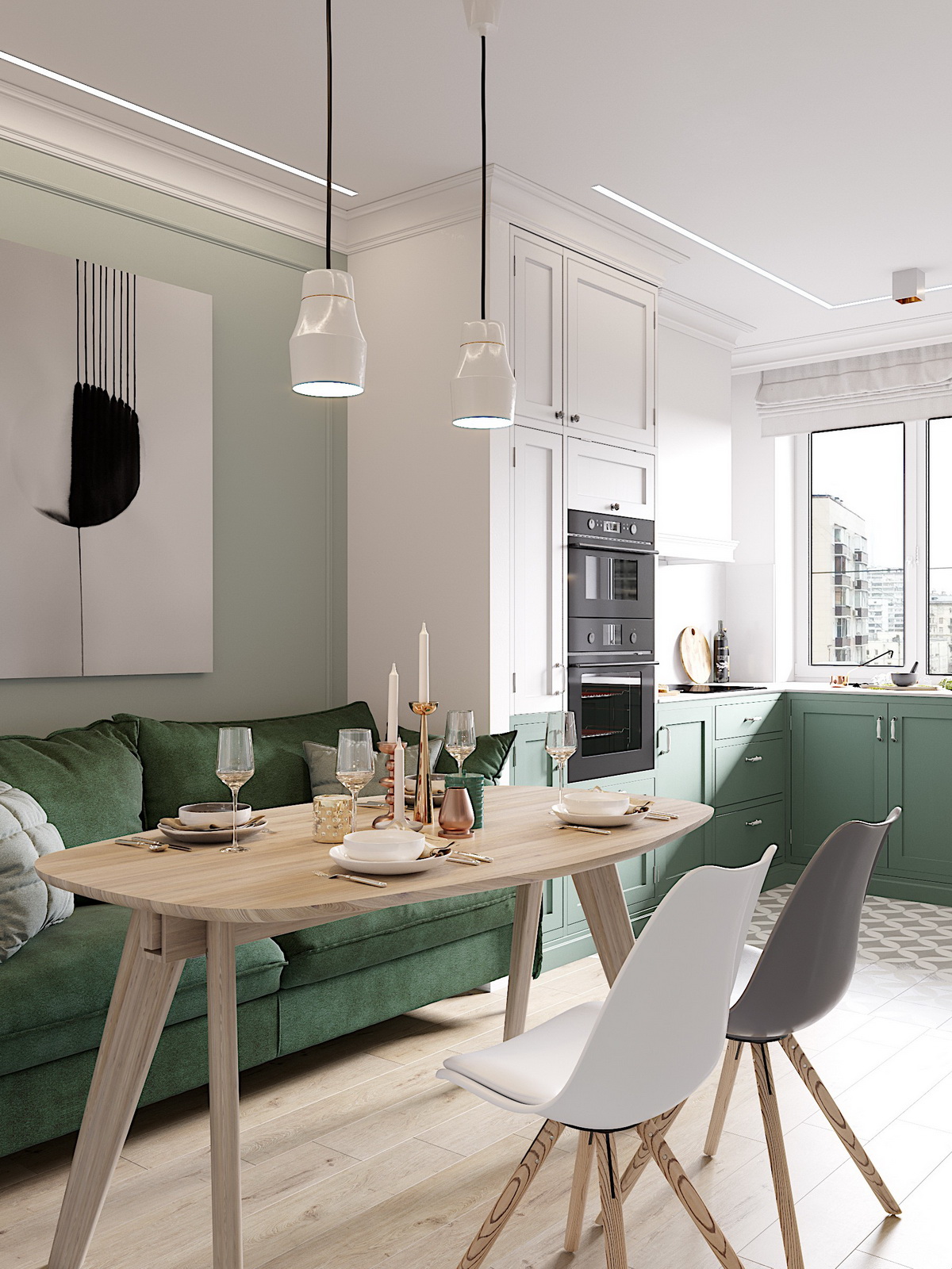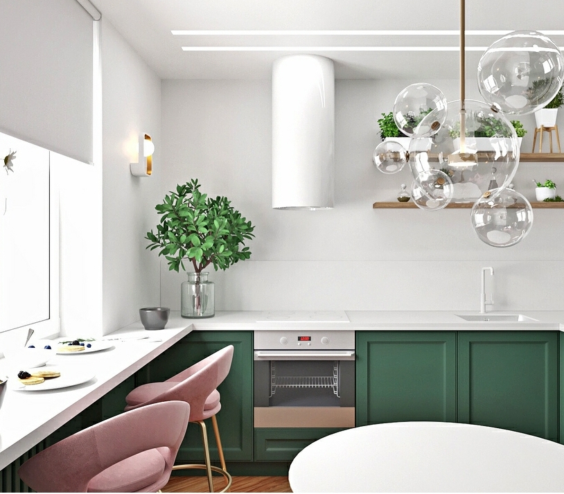 Светлая кухня с изумрудными акцентами