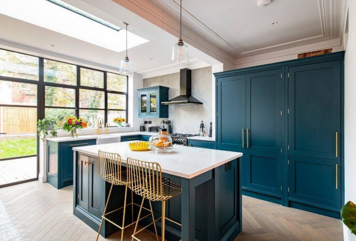 Этот тон хорошо сочетается с золотом, что можно выгодно обыграть с помощью техники, элементов декора и отделки. Единственный нюанс – обилие изумрудного не подойдет для очень маленькой кухни. Этому цвету нужен простор, чтобы не выглядеть «тяжелым» и мрачным.