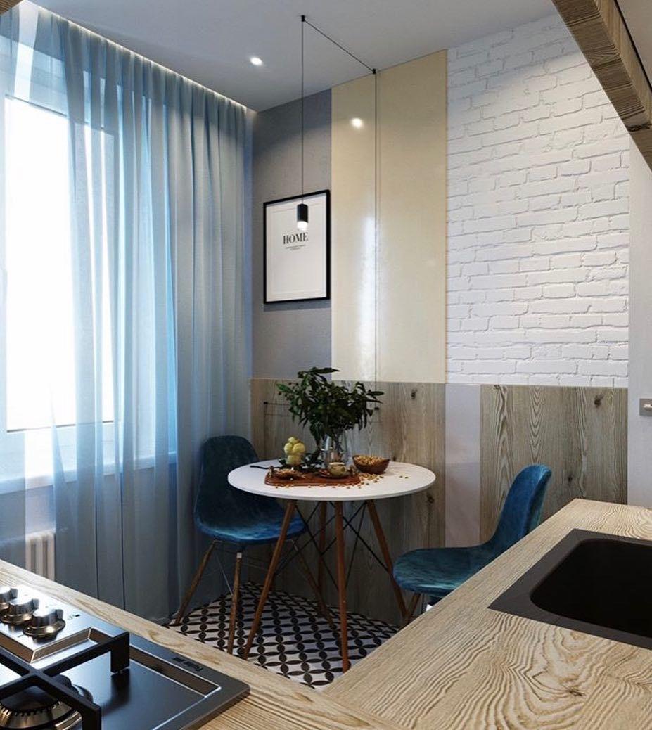 Минимум лишних предметов, акцент на прямых линиях, просторе и свете — это то, что нужно для небольшого помещения. Подбери светлые кухонные шкафчики и тумбы, отдай предпочтение встроенной технике, а обеденную зону перенеси в другую комнату. Кстати, подоконник можно трансформировать в столешницу — здесь можно и готовить, и перекусить.