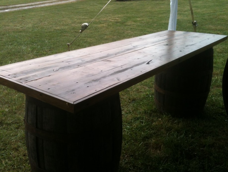 Столешница, установленная на бочку из дерева или металла, может выполнять функции обеденного стола. Благодаря хорошей устойчивости такой стол выдержит чашки и тарелки.