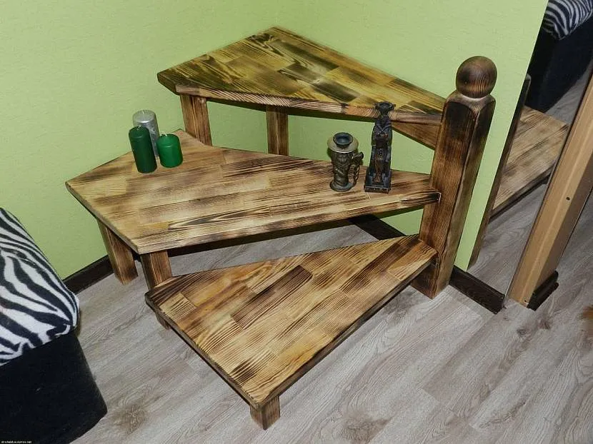 Понимая, что можно сделать из старого паркета, легко собрать угловую конструкцию. Плашки соединяют «елочкой», симметрично сдвигая ряды. Из 2-3 готовых столешниц получается многоярусная полка. Детали устанавливают на стойки или ножки, которые окрашивают в тон мебели.