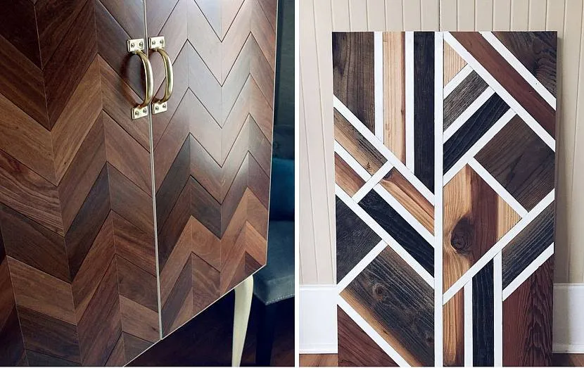 Под старым паркетом часто прячут неприглядные части предметов интерьера. Обветшалые фасады шкафа легко замаскировать плашками. Если напольного покрытия много, то можно полностью задекорировать дверцы. При небольшом количестве детали приклеивают к поверхности, оставляя прорехи.