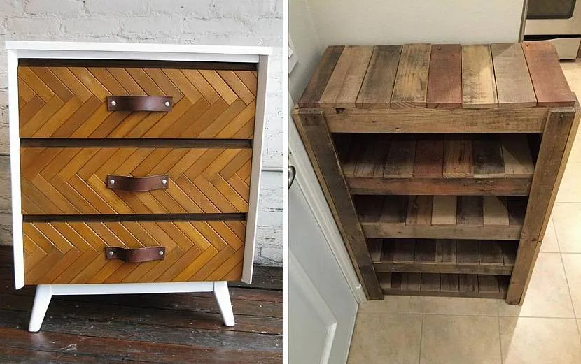 Небольшие предметы интерьера собирают из старого паркета. Декоративность мебели зависит от рисунка, который используют для фасада тумбочки. Узкие высокие комоды с дверцами в елочку или плетенку станут ярким элементом помещения. Для ТВ-панели можно сделать низкую конструкцию с открытыми полочками.