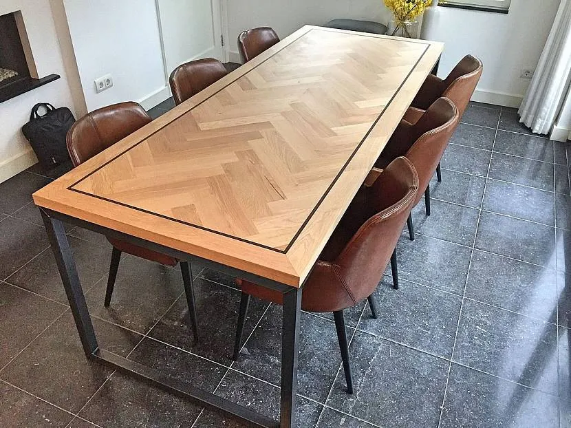 Из старого паркета дизайнеры рекомендуют собрать стол с верхней частью из плашек. Толщина столешницы по параметрам не уступает традиционным моделям. Детали склеивают специальным составом. Для надежности часто конструкцию соединяют на подложке из фанеры.