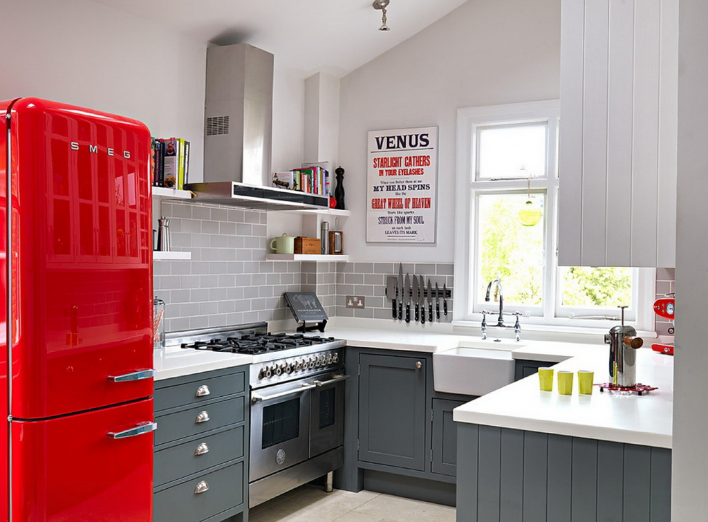 Большинство моделей ретро-холодильников относятся к внешнему виду оборудования 60-х и 70-х годов. Безусловно, такой прибор подойдет для деревенской кухни. Однако, если вы хотите, чтобы он был элементом обустройства современной кухни, добавьте еще один элемент, характерный для этого стиля.