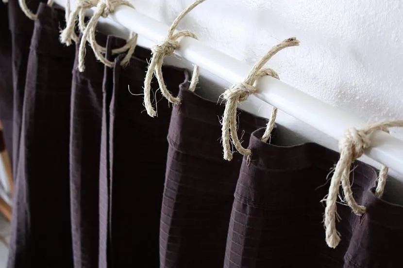 Для кухни лучше подобрать лёгкую ткань, которая долго остаётся чистой, и в то же время легко выстирывается. Идеальным вариантом является лён. Кстати, к такой ткани можно подобрать обычную верёвку в качестве петель. Это будет смотреться интересно и гармонично.
