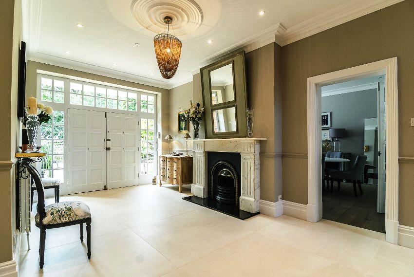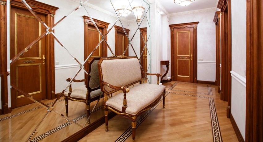 - Для дизайна прихожей выбирают натуральные строительные, отделочные и декоративные материалы. Здесь устанавливаются большие зеркала и используются роскошные аксессуары в умеренном количестве.