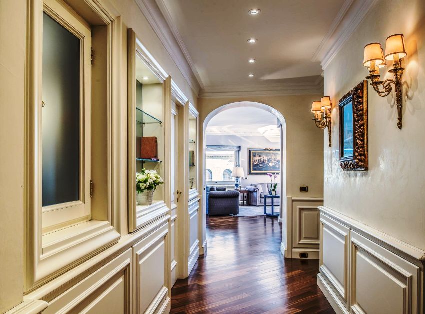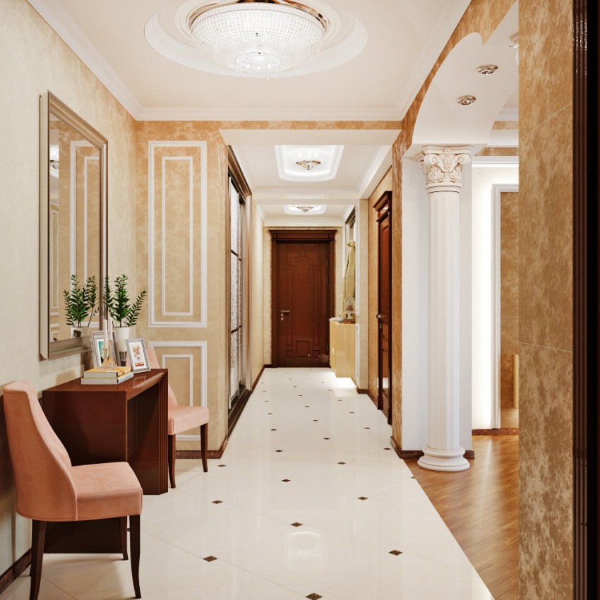 Более выгодно классический дизайн можно воплотить в коридорах квадратной или прямоугольной формы
