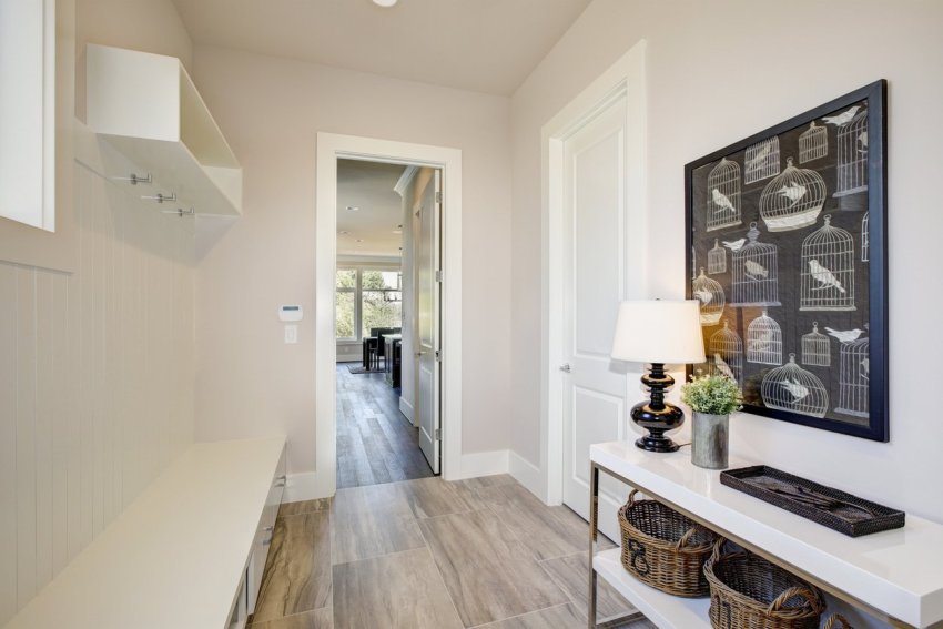 В прихожей всегда собирается много грязи, принесённой с улицы. Поэтому при отделке следует использовать материалы, которые легко будет чистить и мыть.