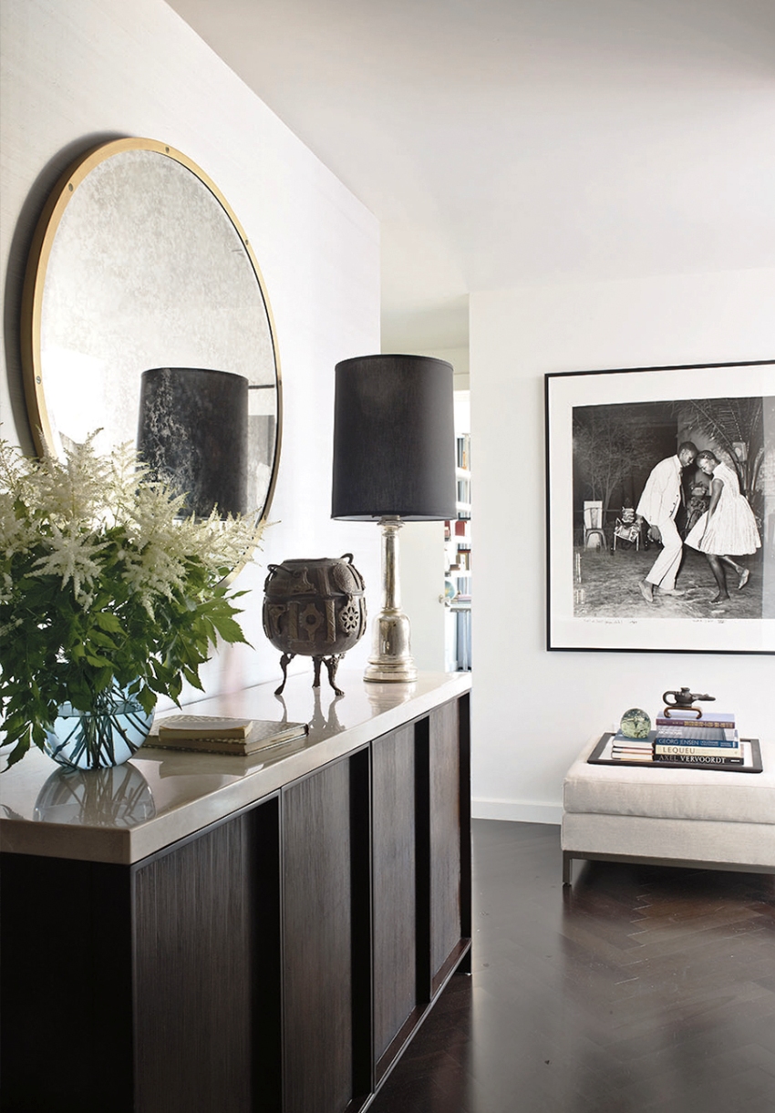 Мебель должна быть симметричной. Лучше, если в дизайне будут преобладать правильные геометрические формы и четкие линии. В качестве декора допускается использование колонн, резьбы и других деталей. Желательно, чтобы в прихожей была установлена многоуровневая система освещения, предусматривающая проникновение света в каждый уголок помещения.