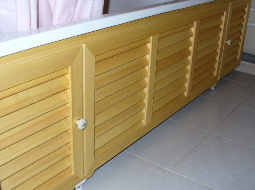 Изначально выполняется основа из дерева. Доски, что пропитаны средством против грибка и вскрыты лаком, укладываются по периметру ванны, а на них выполняется крепление стоек.
