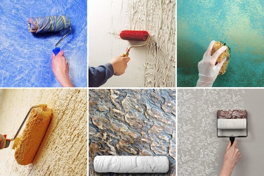 - Трафареты, валик простой и фактурный – придание поверхности текстуры и отпечаток рисунка.