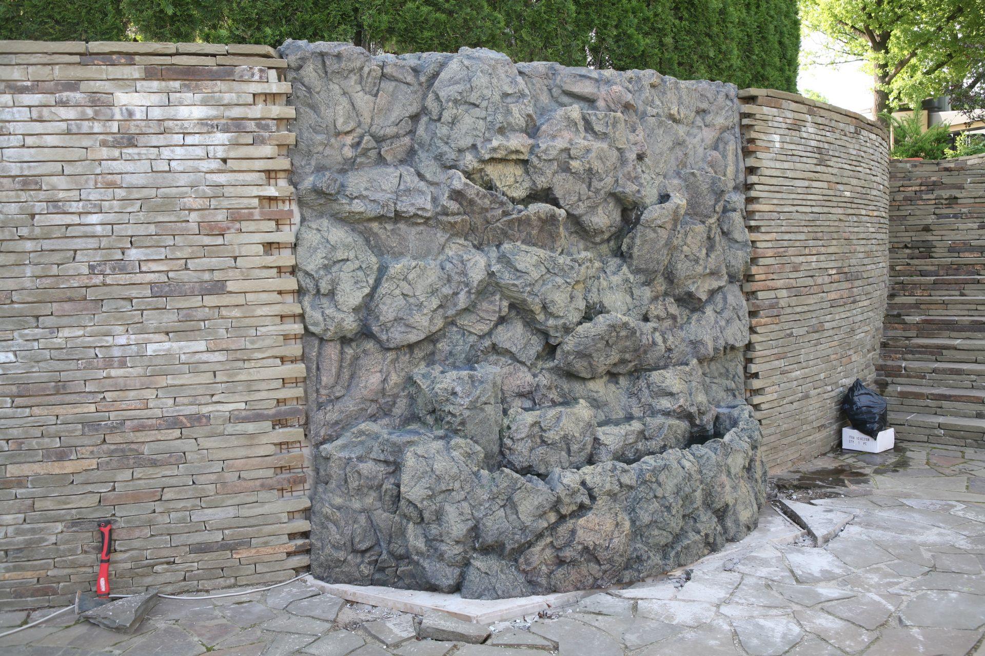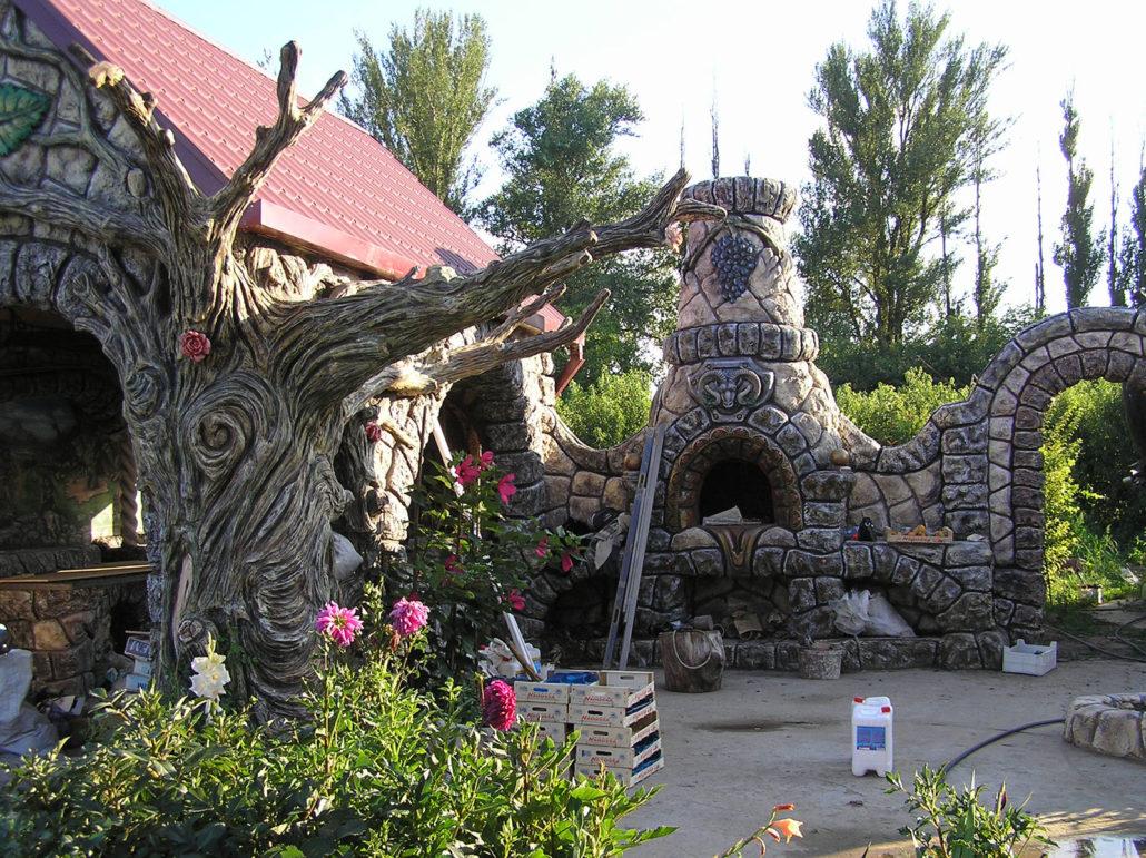 Не слишком распространенная техника: рисунок копируется на полусухой блок бетона, потом выскабливается стамесками или ложками. Главное — успеть до того, как бетон станет неподатливым для обработки