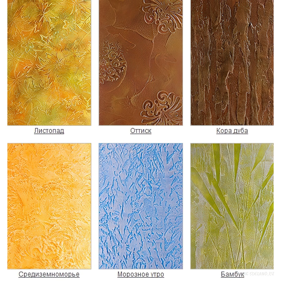 Готовая смесь может содержать крупицы песка, мраморной крошки, различные волокна. По виду связующего элемента фактурную штукатурку делят на: