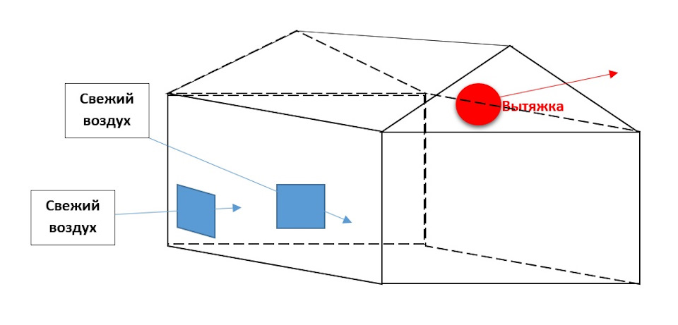 На рисунке можно заметить, что вход воздуха и его выход расположены почти по диагонали параллелепипеда, форму которого имеет гараж. Значит, застойных зон здесь не будет.