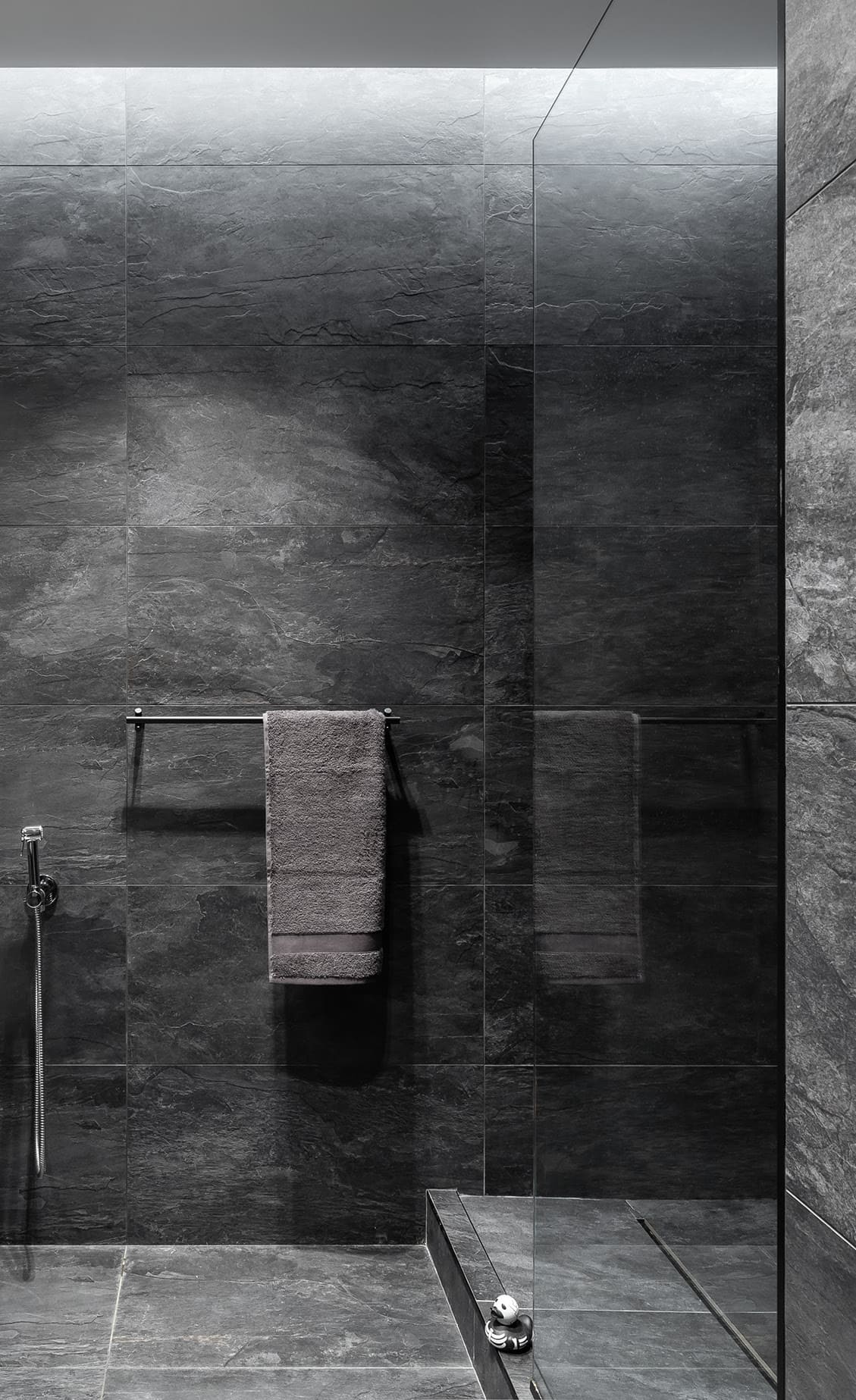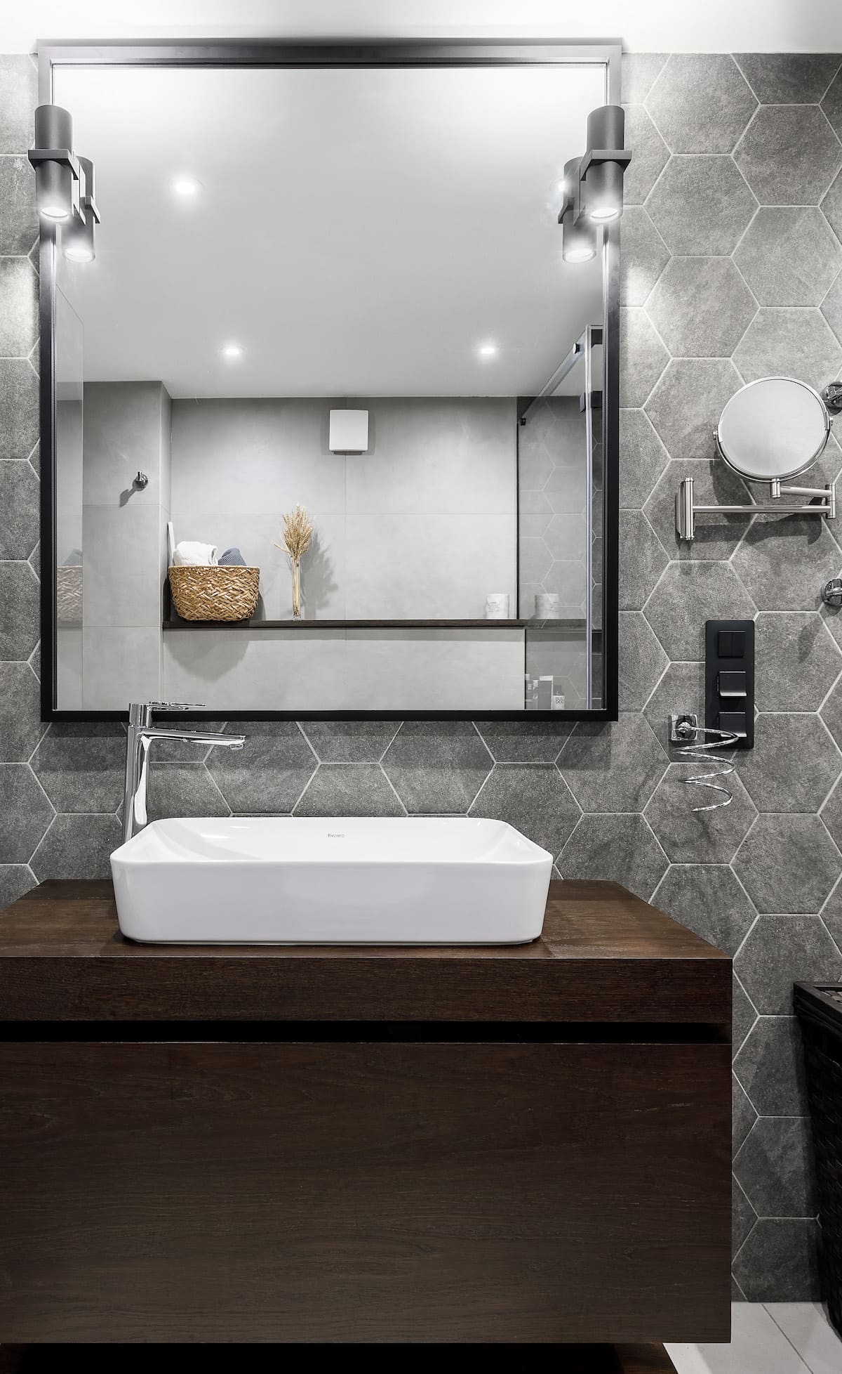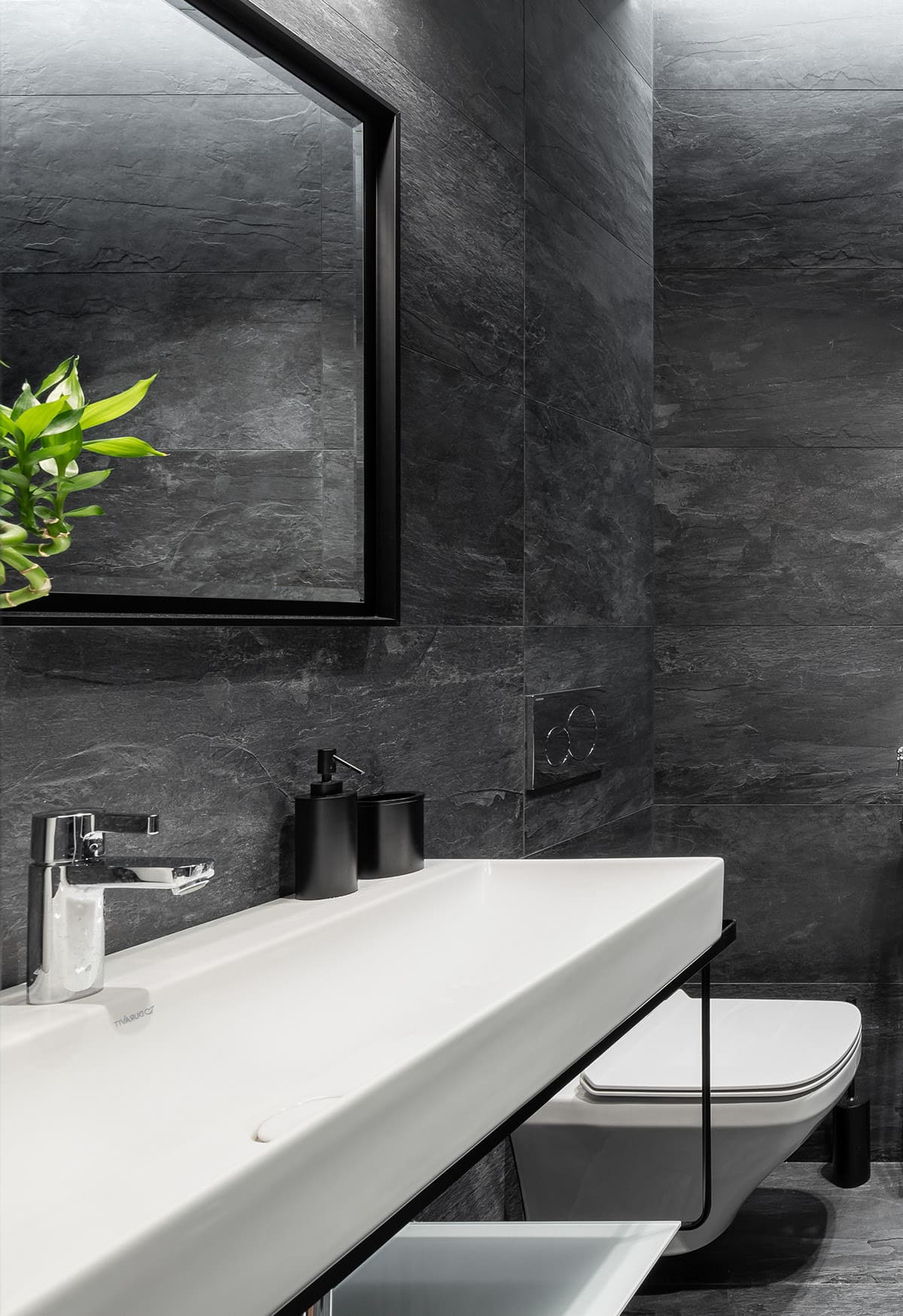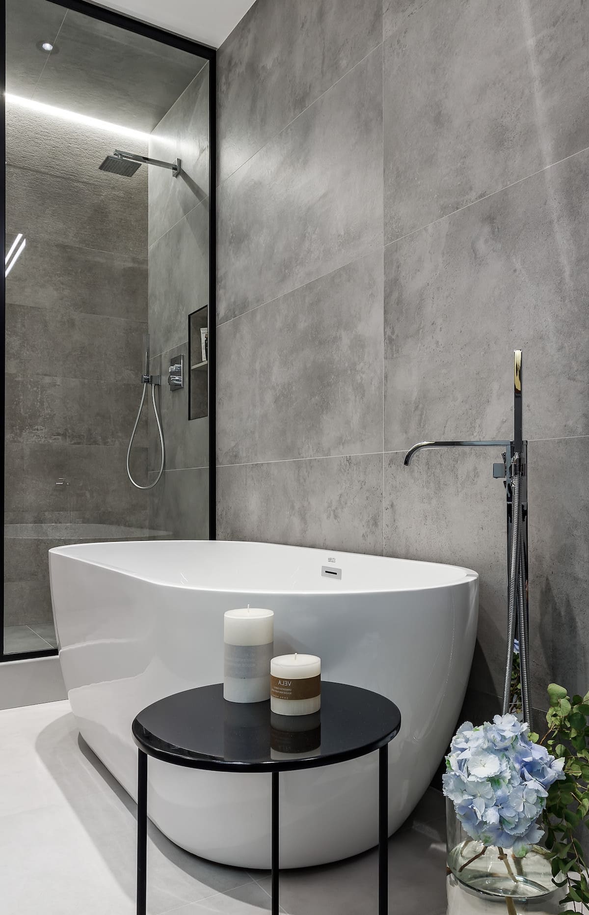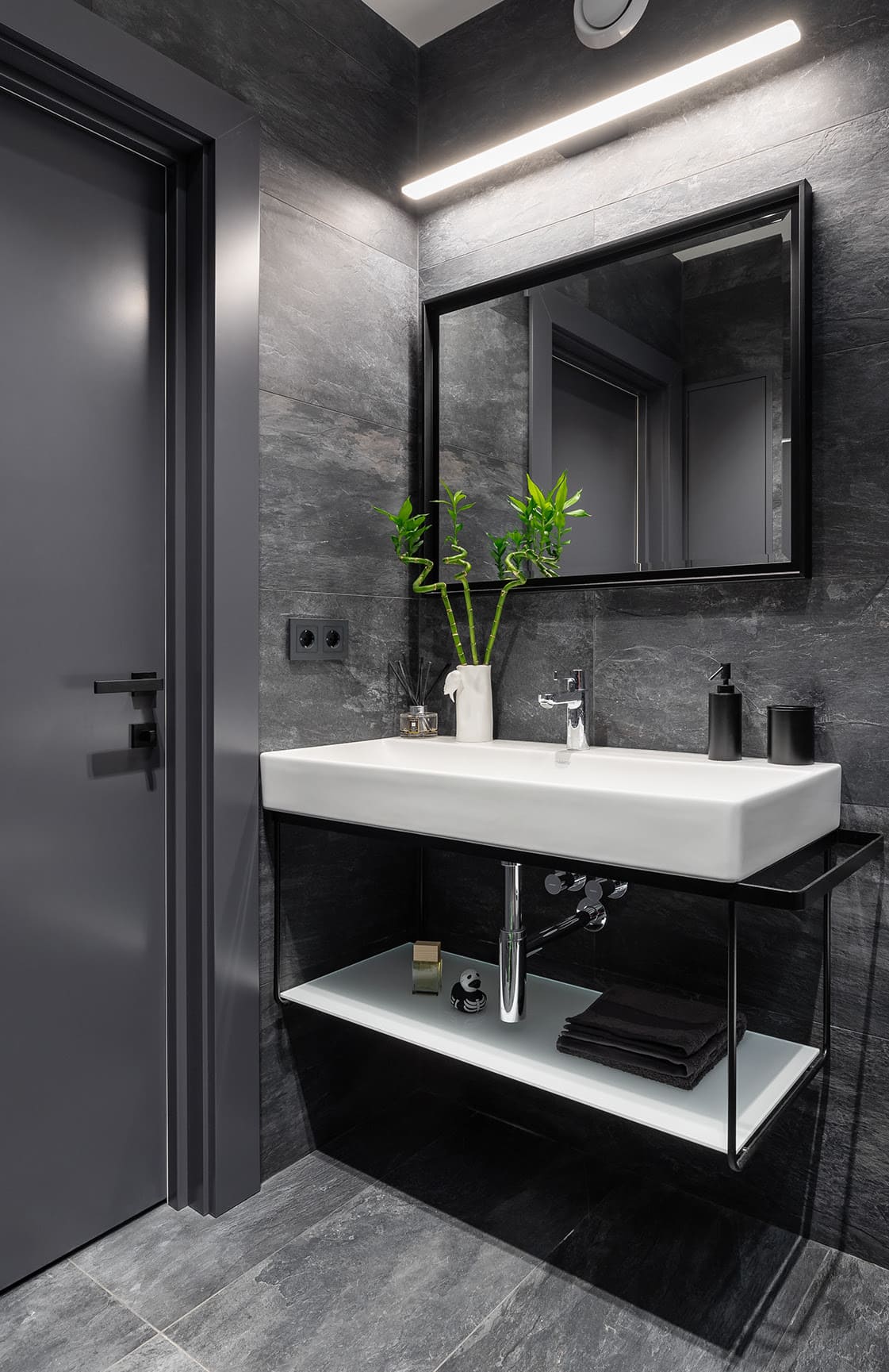 В этом современном минималистичном интерьере в серых тонах столешница из чёрного мрамора моментально притягивает внимание наравне с каменной чашей ванны