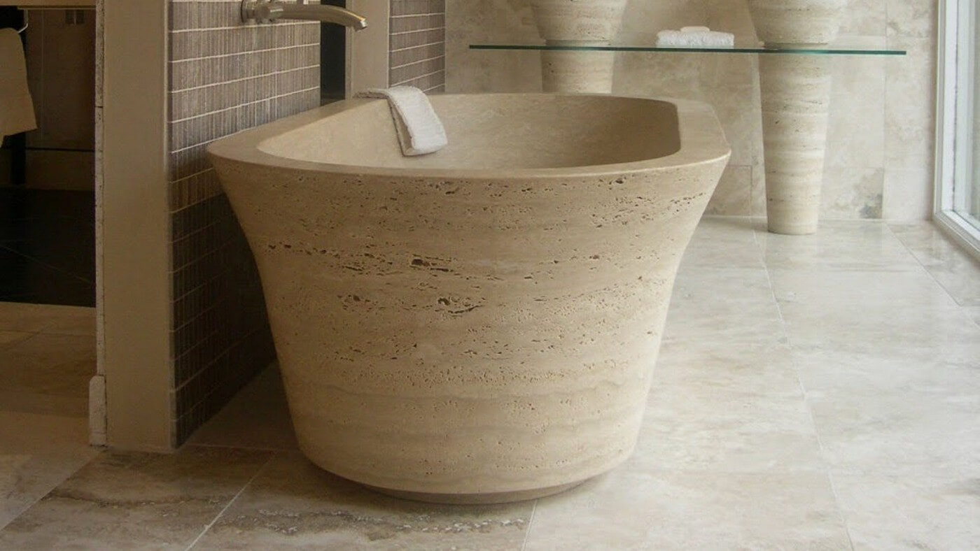 Если позволяет бюджет, ванна из цельного куска мрамора или травертина станет главной достопримечательностью дома, вокруг которой можно выстроить все остальные детали.