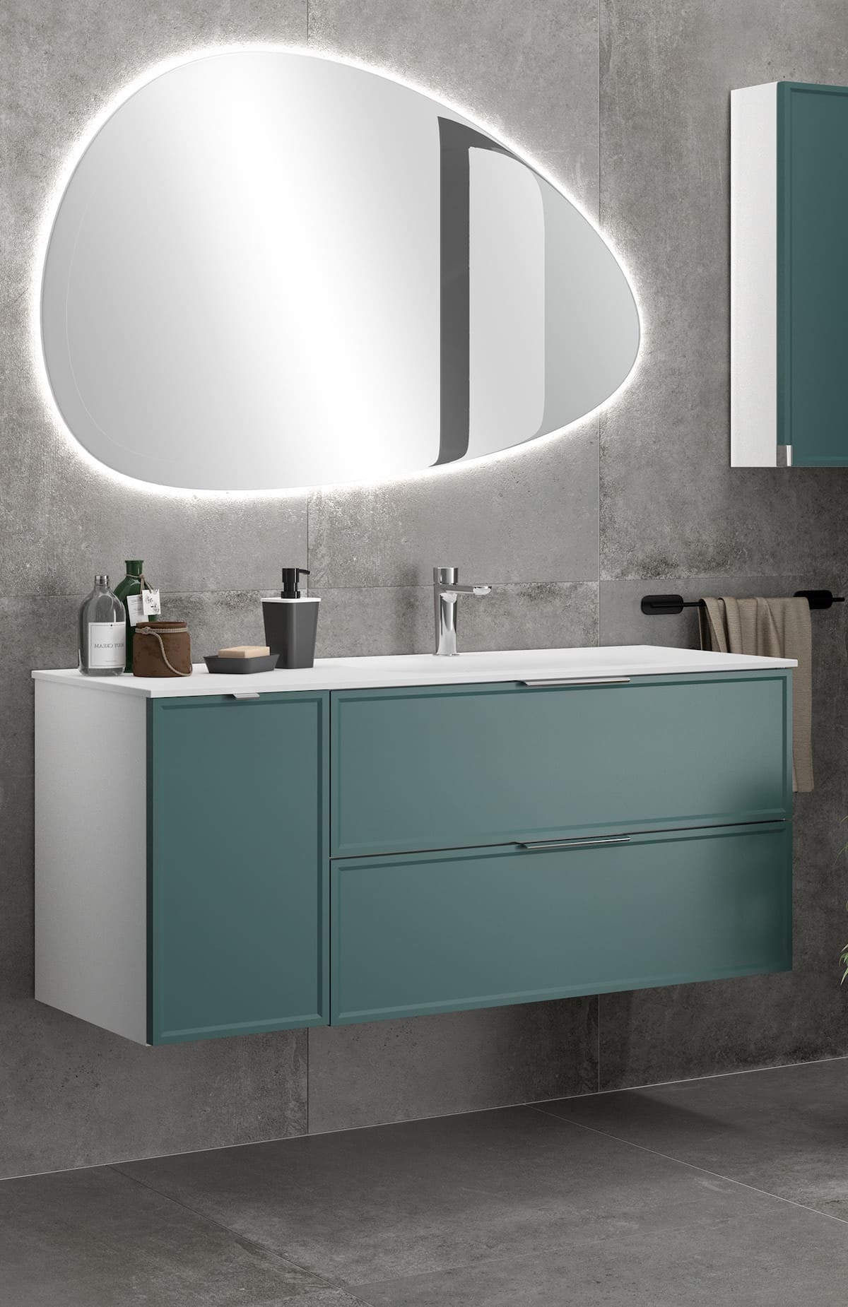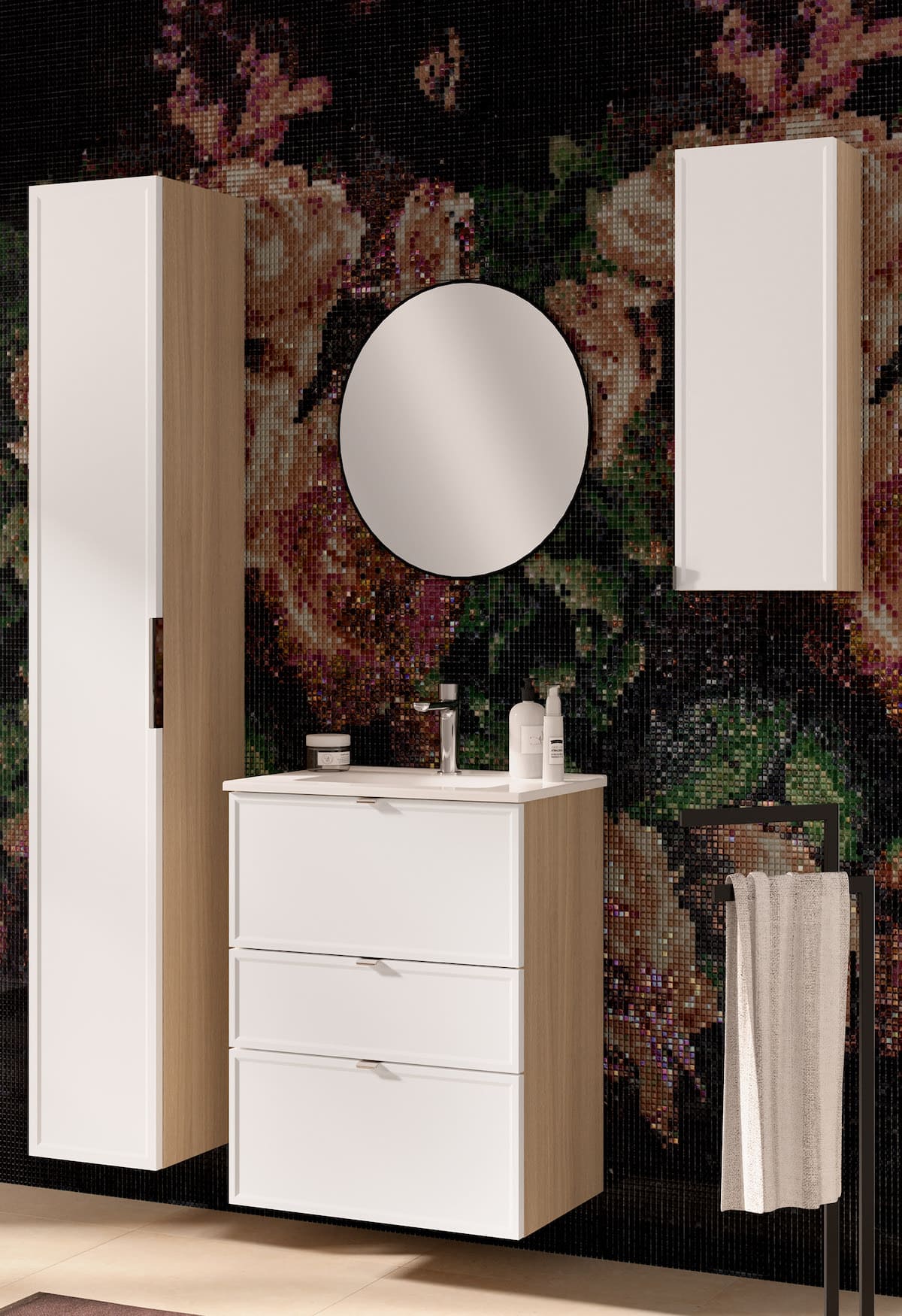 Планируя расположение предметов интерьера, не нужно забывать о вертикальном пространстве. Здесь могут располагаться высокие и узкие пеналы, подвесные шкафы и полки, сушилки для полотенец. При наличии столешницы ее свисающий край можно превратить в вешалку для полотенец. Свободные места на стене уместно занять открытыми полками.