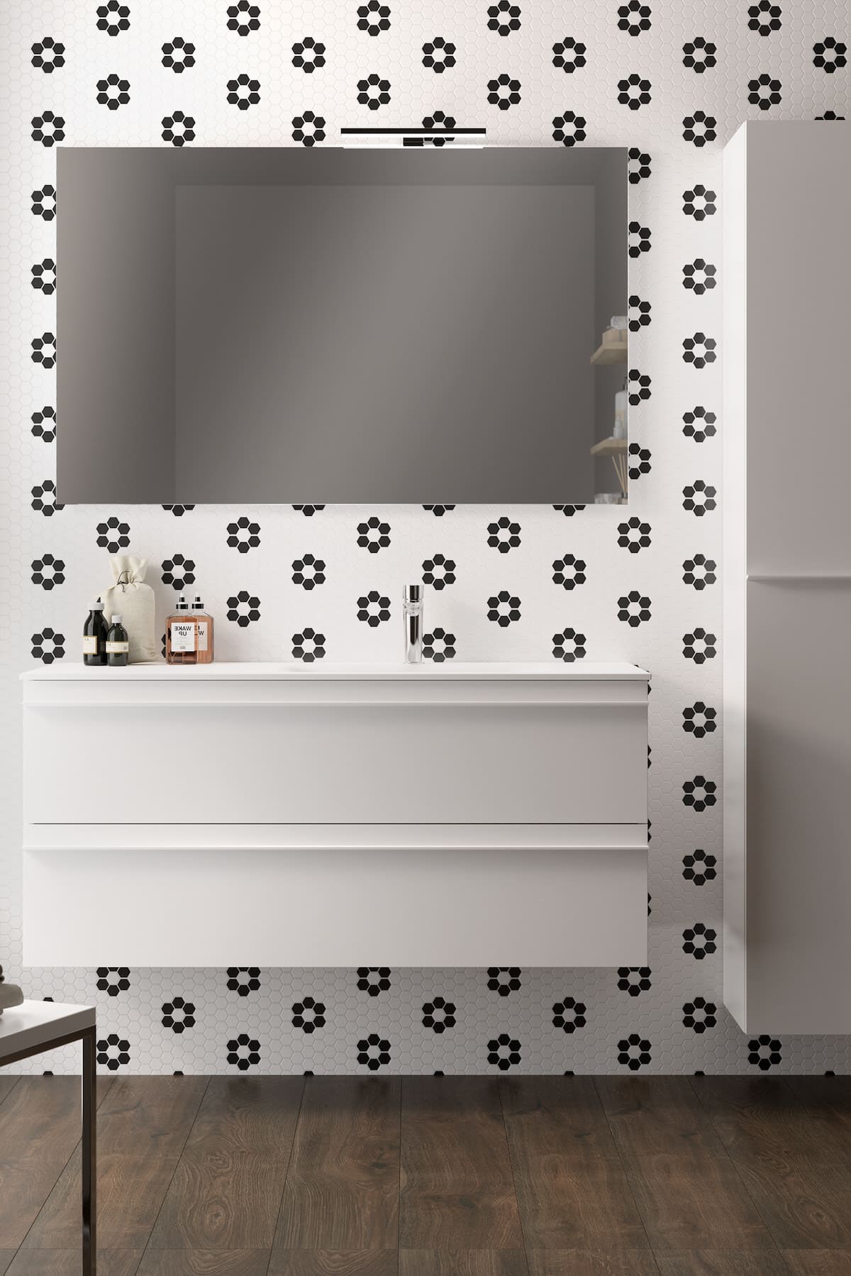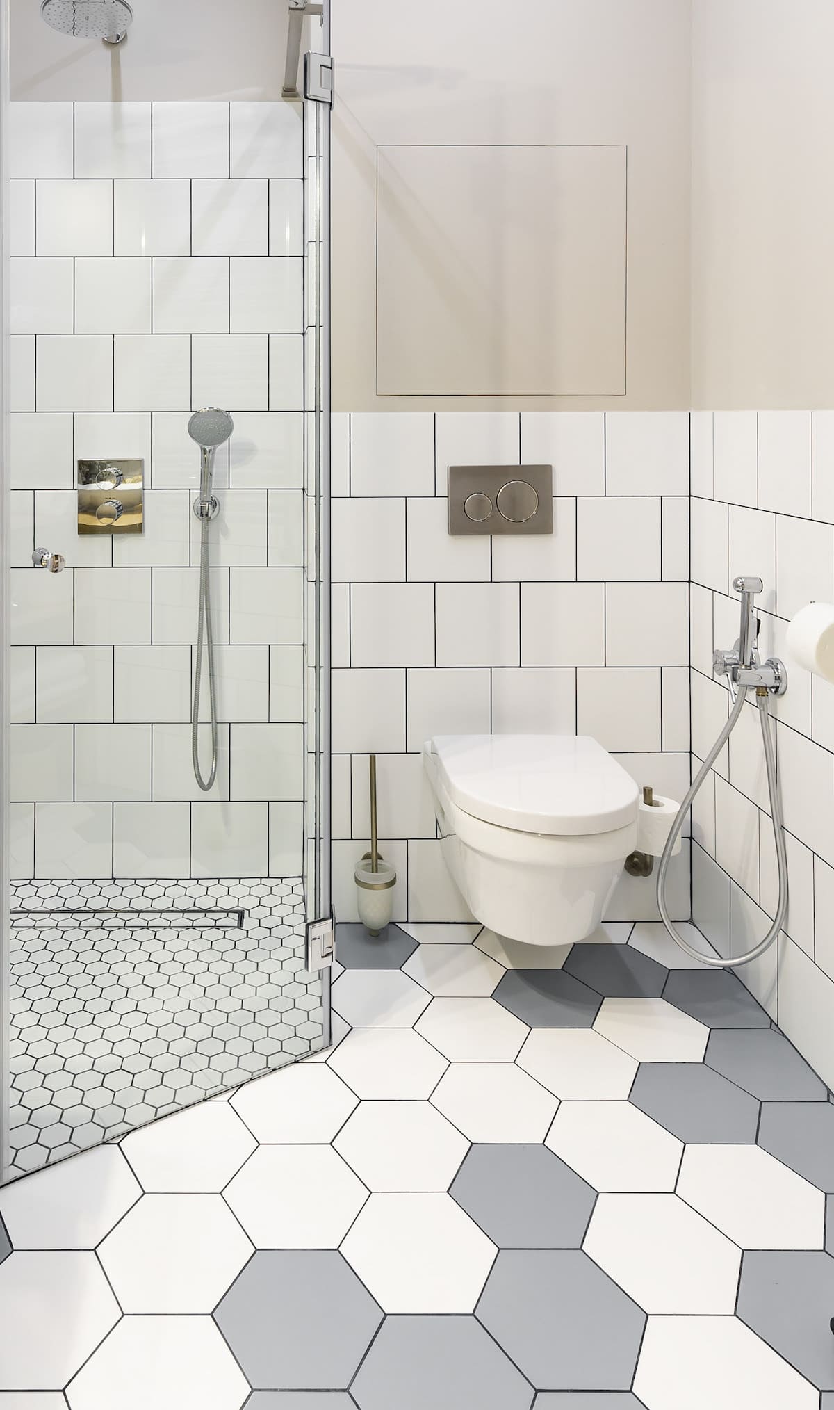 В монохромной ванной комнате пол можно оформить лоскутной плиткой «пэчворк», которая привлечет к себе внимание, становясь главным декоративным элементом. Воспользуйся виниловыми наклейками с тематическими изображениями