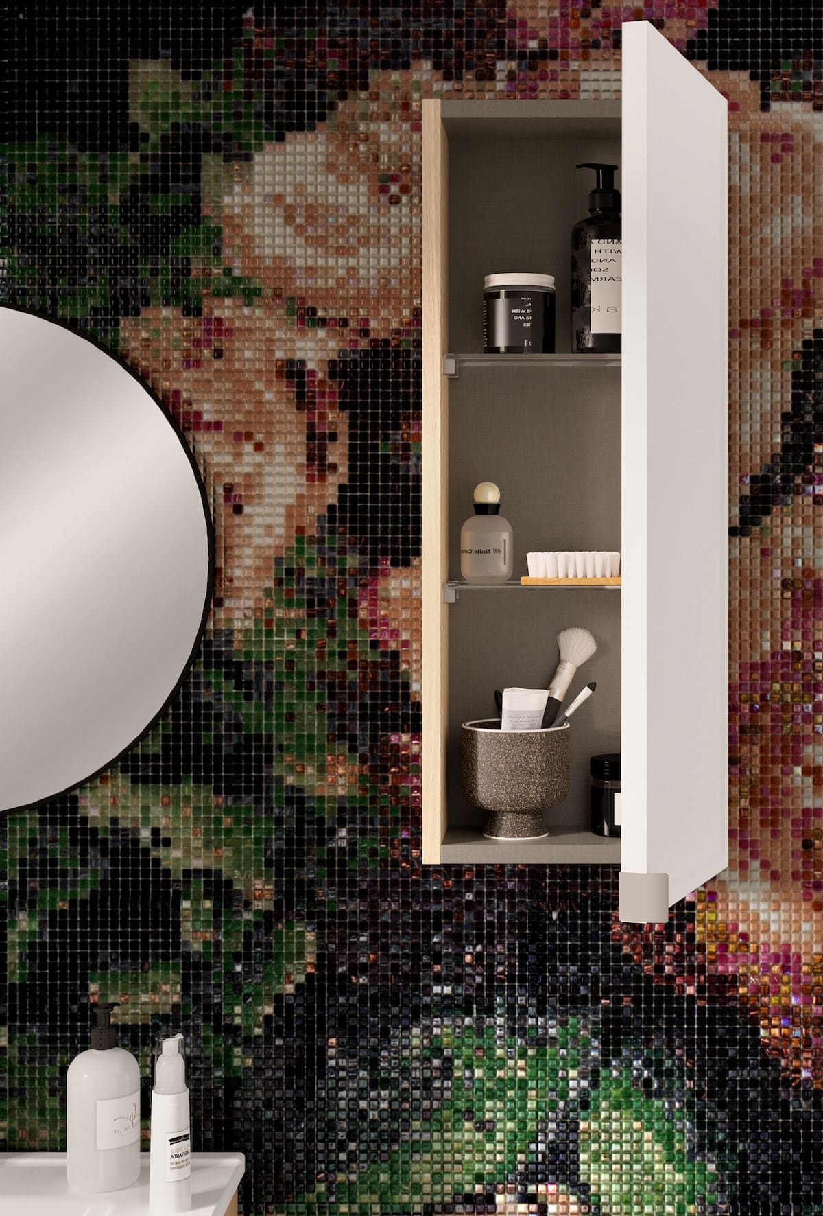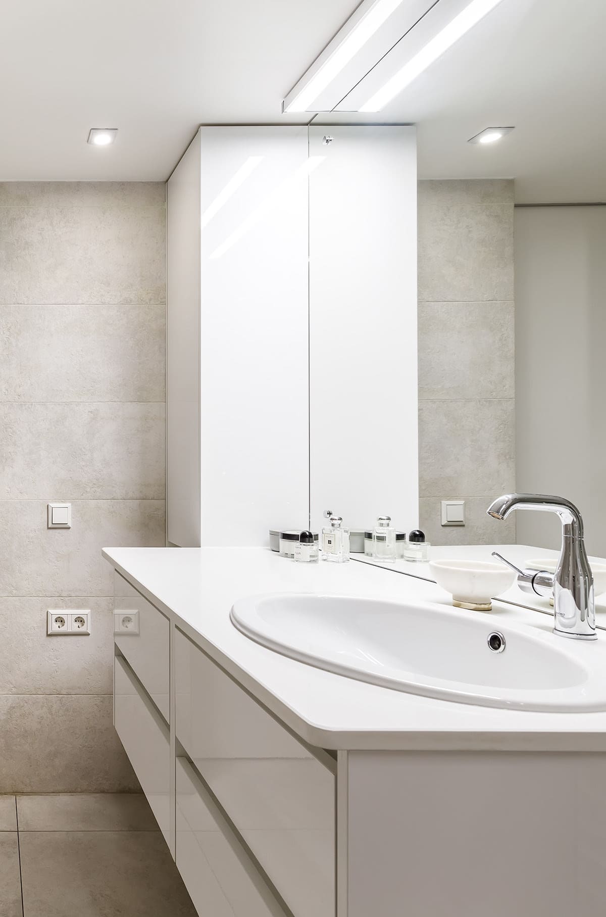 Над умывальником можно организовать утопленную в стене нишу, где будут сберегаться гигиенические и косметические принадлежности. Закрой ее зеркальной дверцей и получишь полезную систему хранения, которая не будет нагромождать пространство.