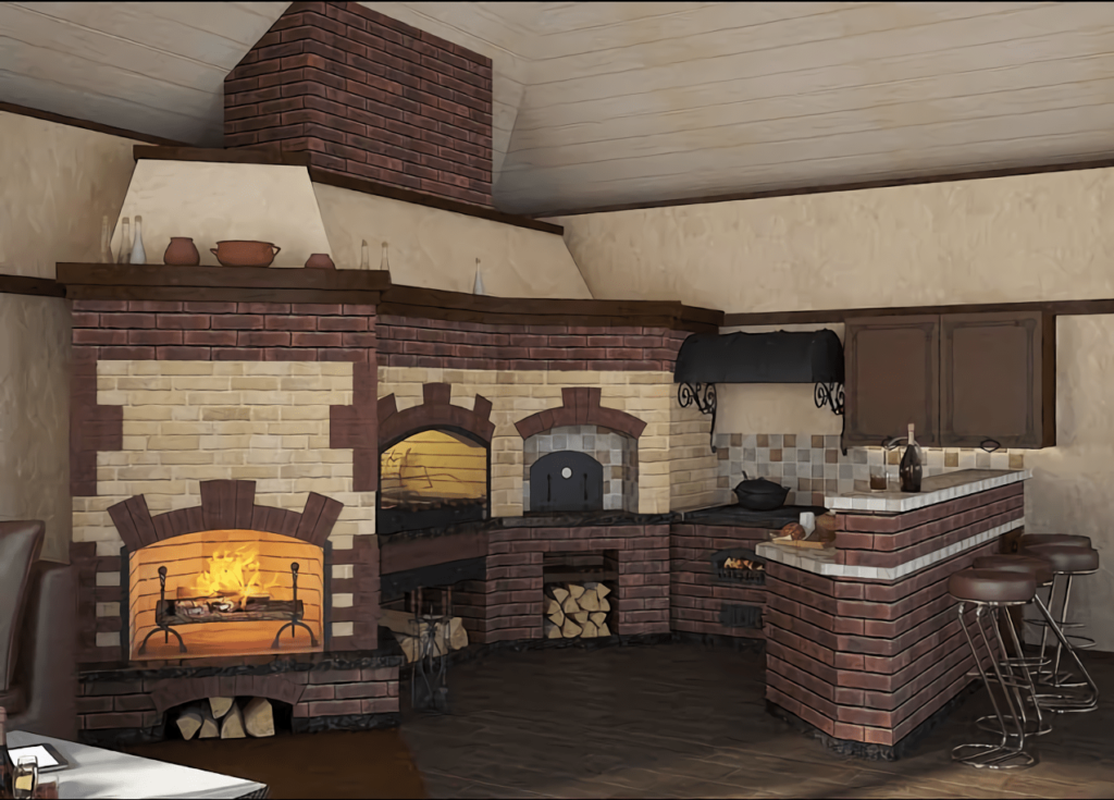 Печной комплекс с русской печью, камином, мангалом и казаном