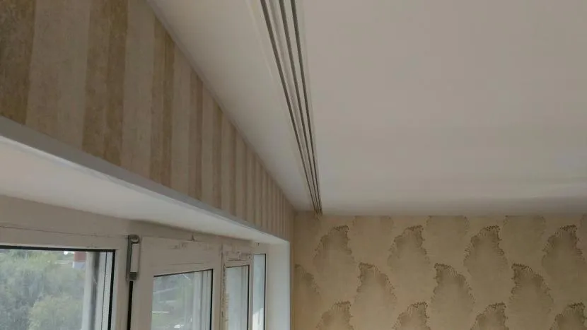 - Струнная конструкция. Имеет свои минусы – под тяжелыми шторами может провисать, и тогда ее не спрятать. Натягивается между креплениями, установленными на противоположных концах потолка. Не может формировать изгибы или закругления. Этот вариант – самый экономичный из всех.