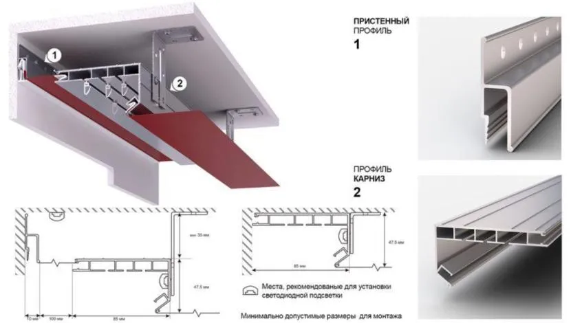 При монтаже натяжного потолка не обойтись без обустройства места крепления карниза. Для этого формируют нишу, которая позволит эффектно закрепить шторы, сэкономить на приобретении карниза в стиль интерьеру и устроить декоративную подсветку.
