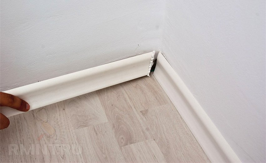 - Плинтус крепится по месту с помощью клея или саморезов.