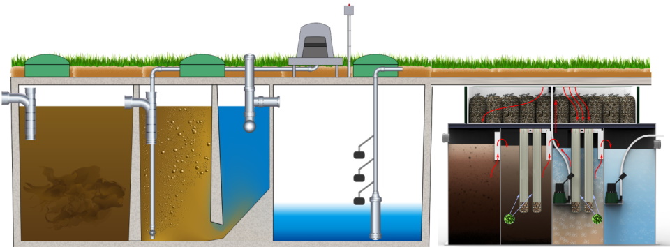 Принцип работы такой станции немного отличается от работы мини-станции тем, что сам резервуар прикапывается или закапывается в землю и соединяется со сливной трубой. При поднятии сточных вод до определённого установленного уровня, датчик замыкает сеть и приводит в действие основной насос.