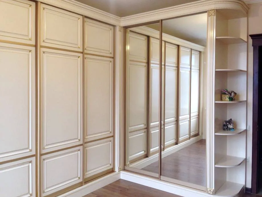 Предыдущий способ установки багета на шкаф купе не подойдет для корпусного шкафа купе, потому что будет некрасиво, когда багет на отдельном стоящем шкафу купе будет выступать за края шкафа купе.
