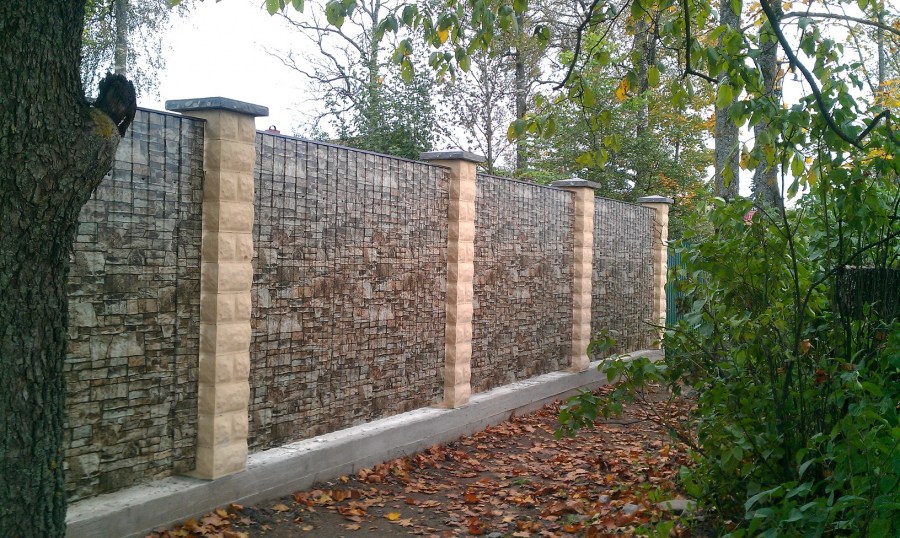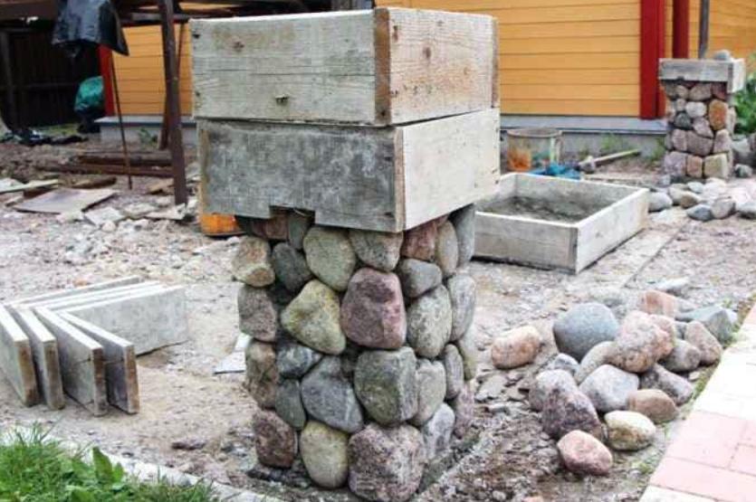 - вокруг опор укладывают валуны, создавая массивные столбы прямоугольного сечения. Их высота должна соответствовать максимальному расчетному размеру ограждения. Для постройки собирают опалубку, в которую послойно укладывают валуны и заливают клеевой раствор;