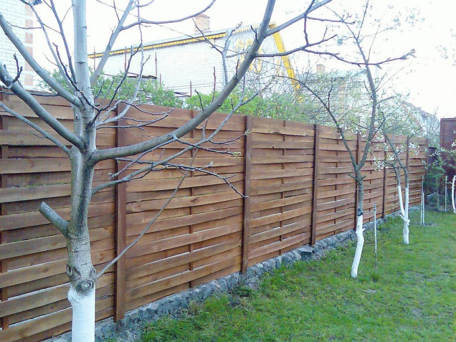 По примерно тому же принципу строится и горизонтальный забор. В этом случае не нужны перекладины, а штакет крепится горизонтально к столбам, удаленным друг от друга на длину облицовочной доски.