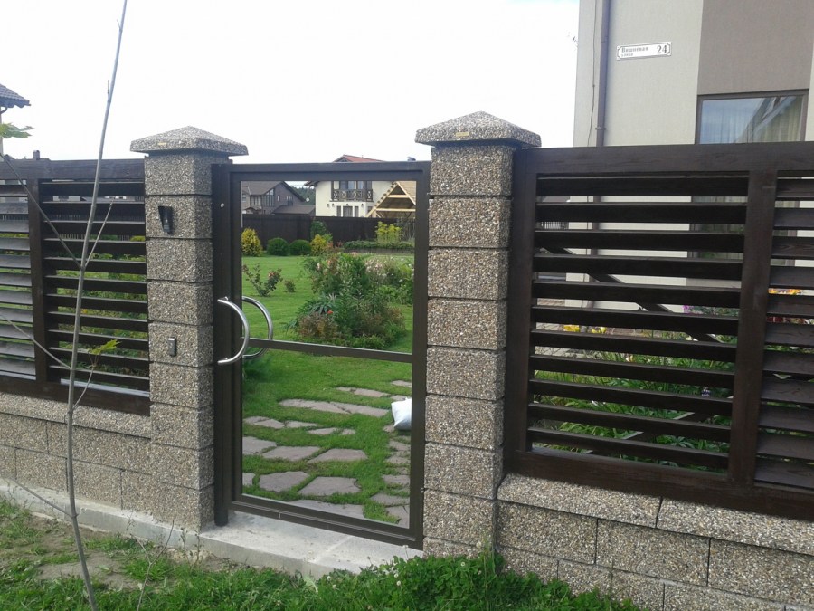 Выбрав какой–то основной материал для забора, принцип стилистического единства можно учесть именно на отдельных его элементах