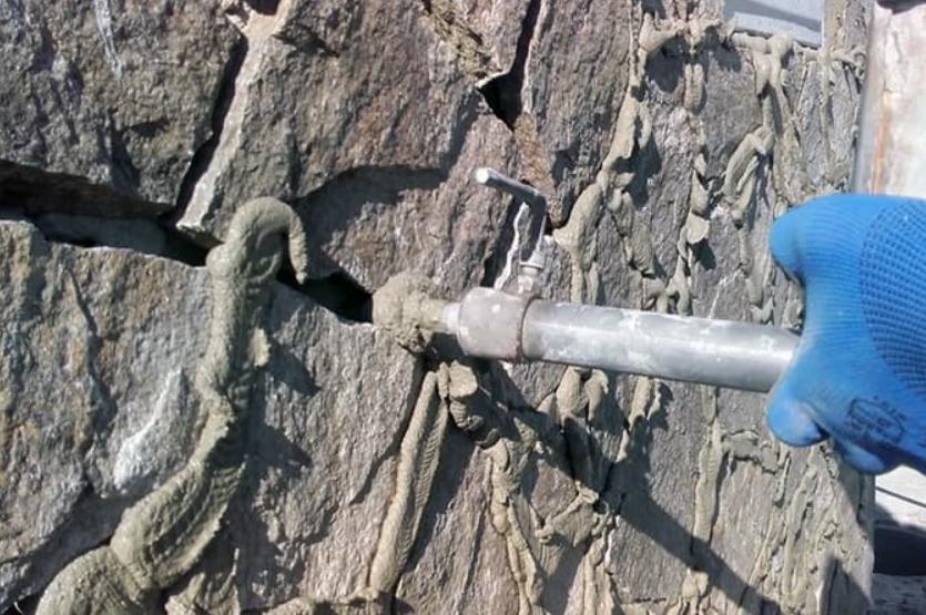 Строить высокую опалубку не рекомендуется — в нее неудобно класть валуны и заливать клей. Правильнее собирать сравнительно низкие участки, постепенно увеличивая высоту опалубки до нужного значения.