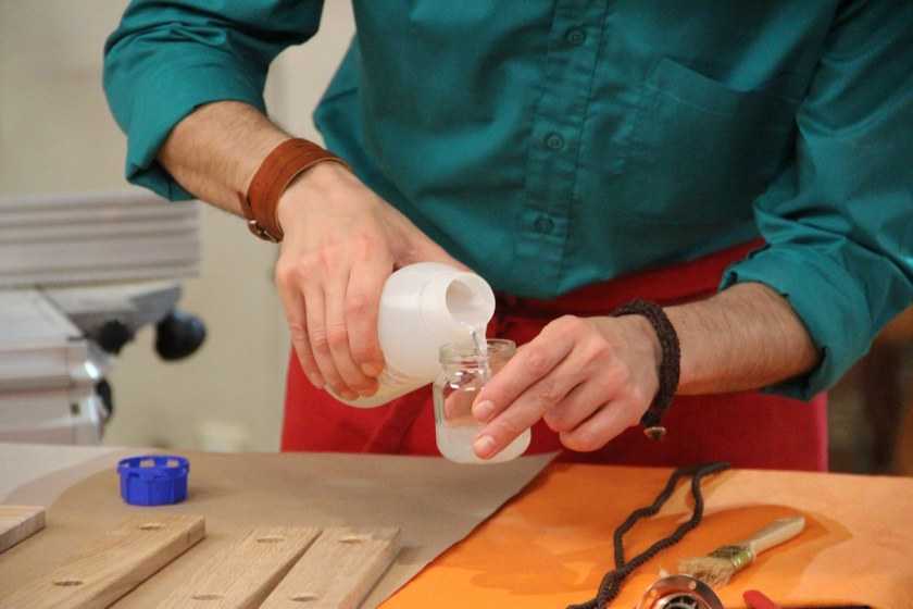 Морилка небольшими порциями наливается на вату и легкими прикосновениями наносится на дерево. В такой работе главное, чтобы морилка при нажатии на тампон не вытекала. Покрывать древесину следует несколько раз.