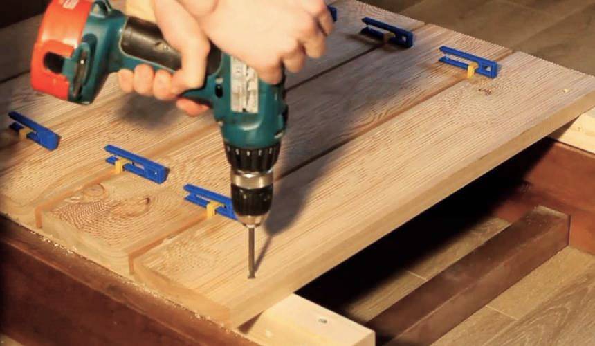 Вначале монтируют первую доску. Перед тем как крепить детали, их необходимо просверлить насквозь — это исключит откалывание и появление трещин. Длину метизов выбирают на 35–40 мм больше чем толщина доски.