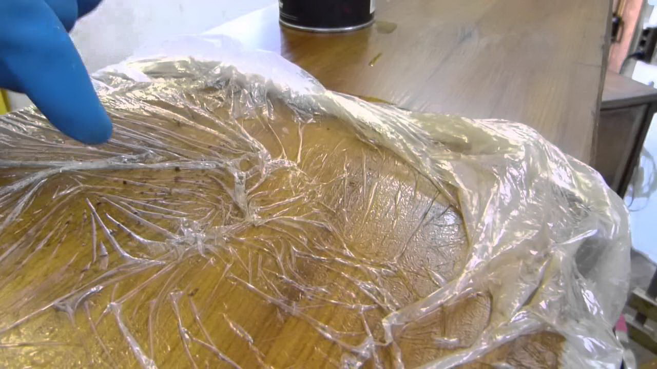 - Верстак или стол, на котором сохнет обрабатываемая вещь, застелите полиэтиленом.