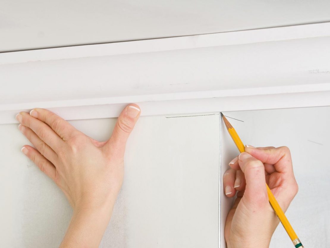- Убираем детали. Место пересечения двух карандашных линий на потолке – это и есть точка направления резки потолочного молдинга.