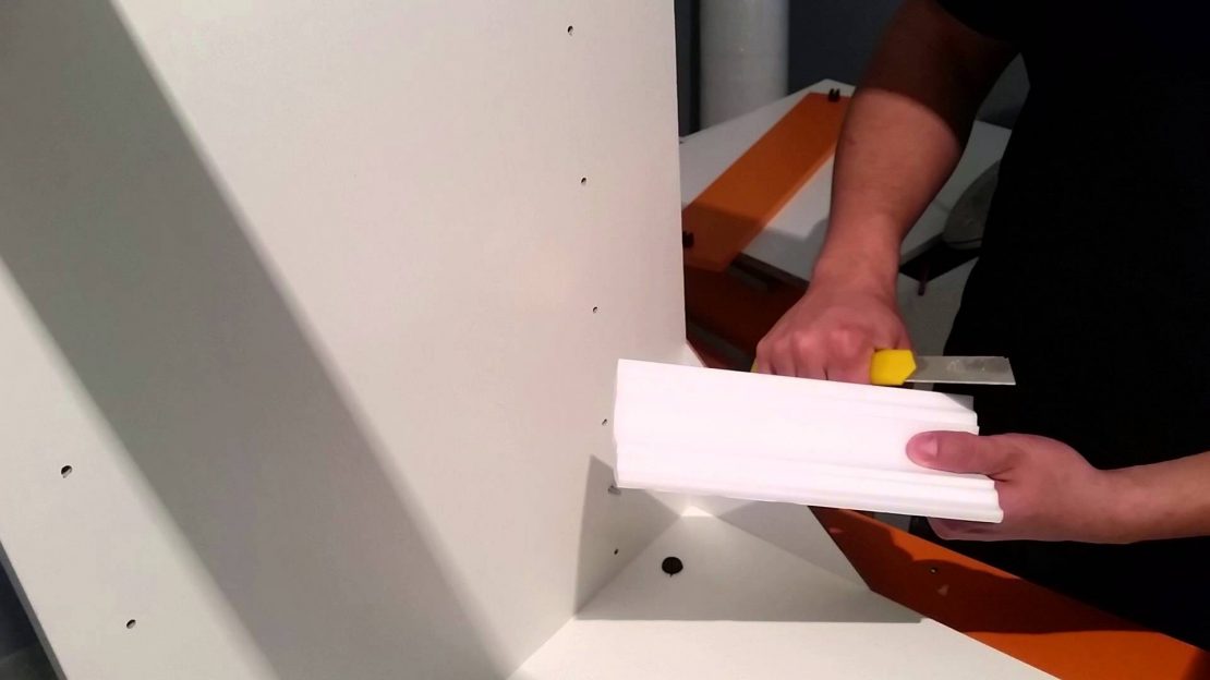 когда внутренний и наружный угол потолочного плинтуса готовы, планки примеряются на потолок. Их нужно будет подрезать согласно направлению примыкания к поверхности;