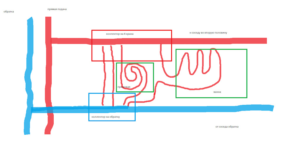 Предистория. Дом на 4 хозяина, на каждую половину от центрального стояка идет по две трубы.Прямая и обратка размер 34″. Трубы заходят в дом на коллекторы. Коллектор на вход с 4-мя кранами, + прямой вывод к соседу. С 2 кранов идет раздача на отопление, с 2-х на теплые полы, один пол в ванну, второй теплый пол в прихожей.