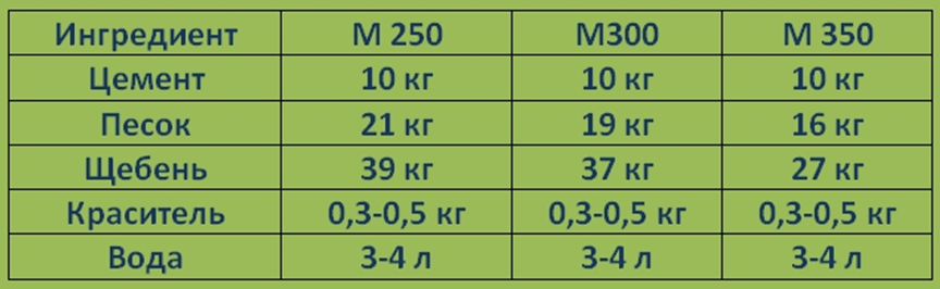 Если используются другие марки цемента и планируется окрашивать смесь, можно использовать данные из этой таблицы.