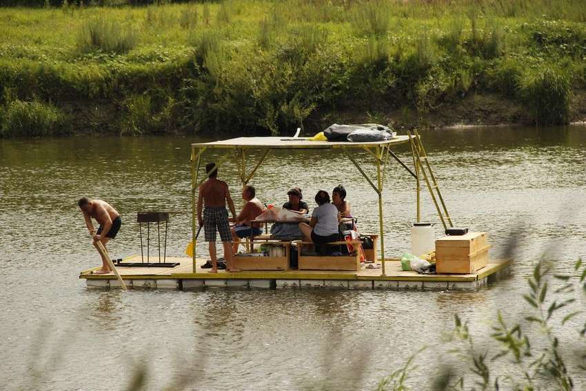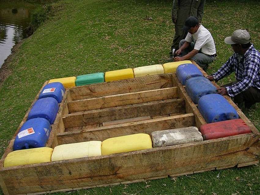 Качественный и сложнопотопляемый плот, можно сделать из канистр. Конечно, чем их больше, тем лучше, но 40 канистр вполне хватает, чтобы удержать на плаву двух людей. Для его постройки понадобятся доски 50х160 см, канистры, верёвка или скотч, энтузиазм.