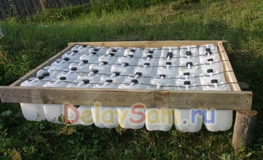 Комбинированный вариант канистр с бутылками, которые объединили в блоки. Не хватает разве что навеса от солнца.