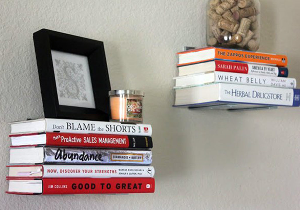 Вариантов установки таких полок несколько — например, можно использовать уголки, которые прикручиваются к стене. Прикрепите к ним металлическую пластину, а под обложку книги приклейте магнит — так она будет лучше держаться. Впрочем, можно просто положить книги на уголки и наслаждаться этой интеллектуальной инсталляцией.