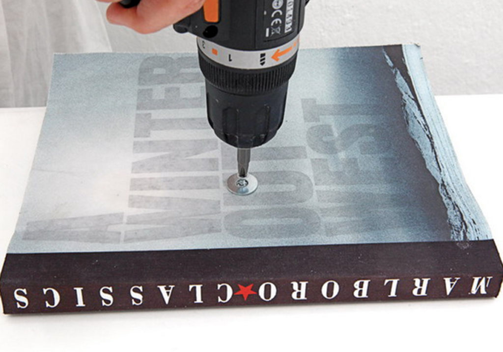 Другой вариант: возьмите кронштейн с тремя отверстиями, три винта с шайбами, три дюбель-шурупа, дрель и отвертку. Наметьте и просверлите три дырки в книге так, чтобы одна из них приходилась на ее середину. Вложите кронштейн между страницами, в готовое отверстие поместите винт с шайбой, а с другой стороны прикрутите вторую шайбу. Плотно закрутите винт отверткой. Повторите то же самое с другими отверстиями. Теперь можно крепить к стене!