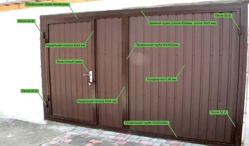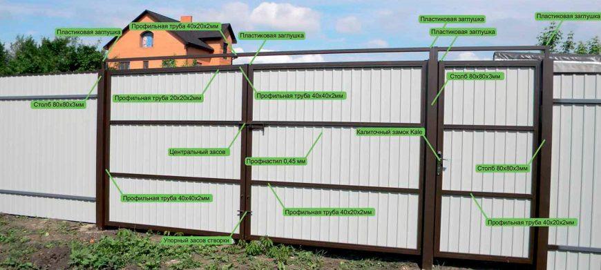 Говоря о размерах будущих ворот, учитываем, то они должны быть такими, чтобы автотранспортное средство в них могло свободно проехать. Высота также зависит от высоты забора, габаритов транспортного средства и размеров листа.