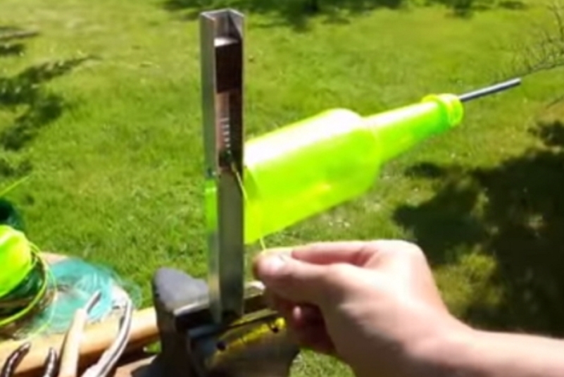Сначала нужно сделать продольный пропил с помощью ножовки примерно на 5 см. Также нужно сделать перпендикулярный пропил для ножа. Сверлом на полтора миллиметра проделаем 2 отверстия под шурупы. Устройство практически готово. Для его использования нужно сделать надрез на пластиковой бутылке и вставить ленту и лезвие в разрезы. Можно приступать к нарезке ленты