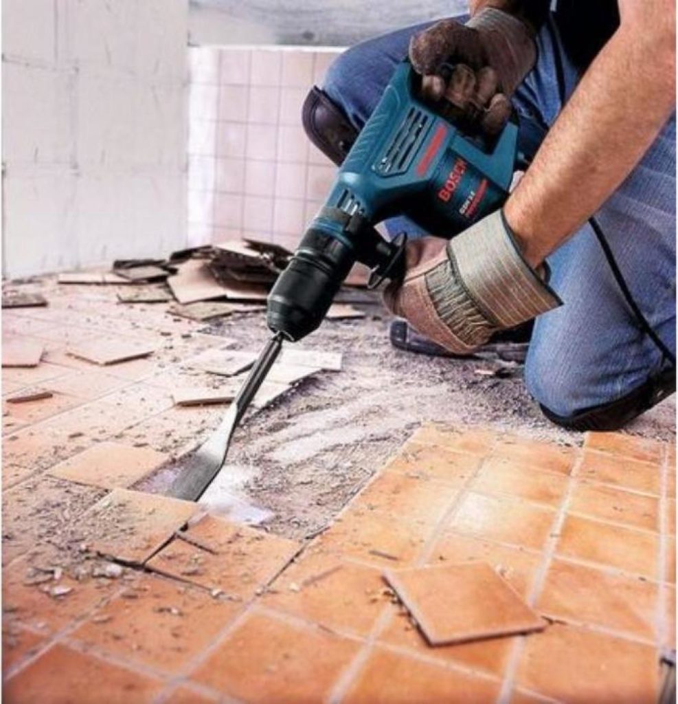 Удаление с использованием перфоратора. Если кафель укреплен цементным раствором, то единственным вариантом демонтажа покрытия будет использование перфоратора, но после него остается много пыли. Также этот метод можно использовать в случае, когда облицовочная поверхность не потребуется в дальнейшем. Принцип снятия плитки такой же, как и при использовании молотка с зубилом.