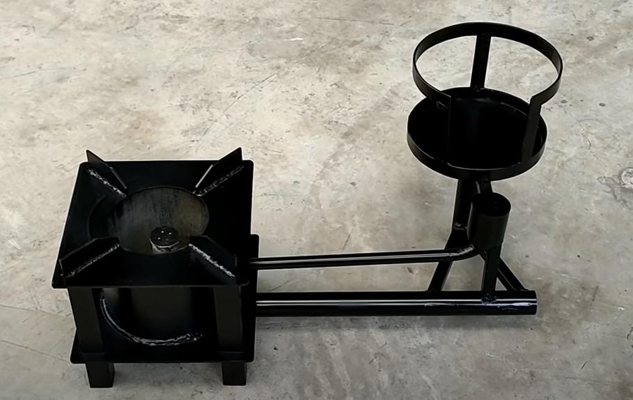 В корпусе полученной конструкции просверливают отверстие для трубы, по которой в печь должно будет поступать растительное масло. Вверху резервуара, где будет происходить процесс горения, приваривают металлическую пластину. На ней заранее делают отверстие для выхода пламени. Верхняя и нижняя пластины соединяют между собой стойками из уголков.